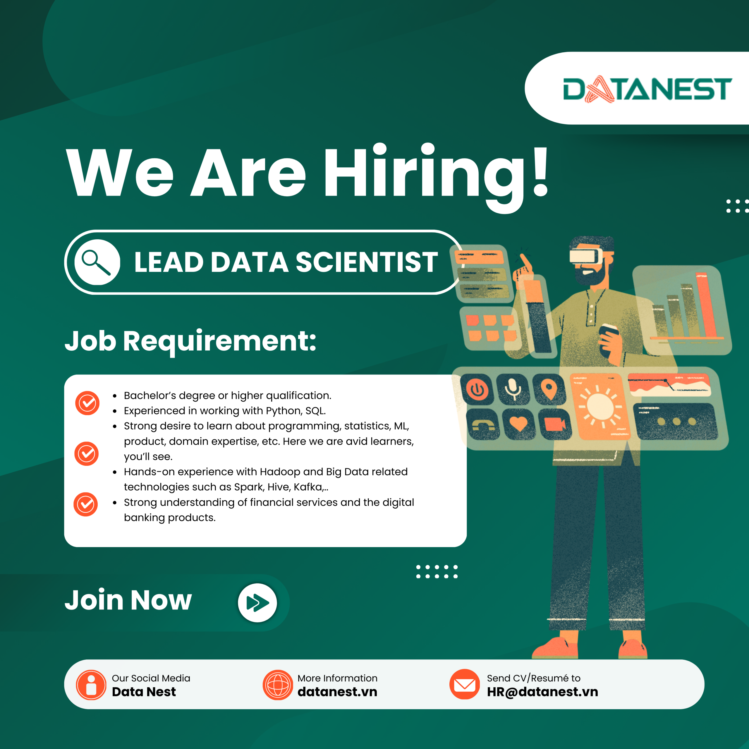 Bạn có sẵn sàng trở thành một phần của đội ngũ năng động và đầy nhiệt huyết, đứng đầu trong việc cách mạng hóa ngành tài chính? Đừng tìm đâu xa – Data Nest chính là nơi dành cho bạn!